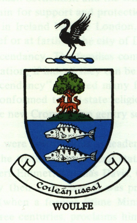 John found that it was first registered by Thomas Woulfe in 1476. One source says the Fish may refer to the family owning fishing rights on Shannon river. The translation of "Coilean Uasal" that came with the coat of arms says it means "Noble Wolf". Sean DeBhulb tells me a "Dinneens Dictionary" translates it as "Enchanted Whelp". (Magic puppy?...Mw) There is one other version of the Coat of arms that is identical in appearance but has the motto: Fides in Adversis. I can't explain the difference. One other note as far as these images. They're almost ringers for one my mom bought for my grandfather about 35 years ago. She sent off 50 bucks to Ireland for an enameled copper coat of arms plaque mounted on a wooden shield. It also has the Woulfe family moto...."Coilean Uasal." The plaque is now hanging in my office.