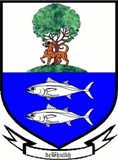 "Per fess argent and azure, in chief on a mount vert in front of an oak tree a wolf passant both proper, in base two salmon naiant barways in pale argent." Motto, Cuileán Uasal, i.e. The Noble Wolf.Crest: A stork wings elevated sable.
